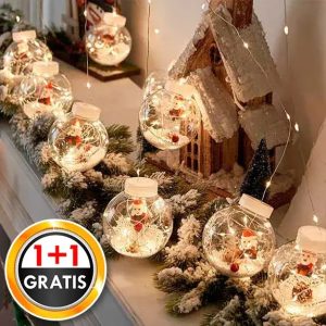 Przezroczyste kule zawierają urocze figurki, sztuczny śnieg, szyszki i światełka LED.
