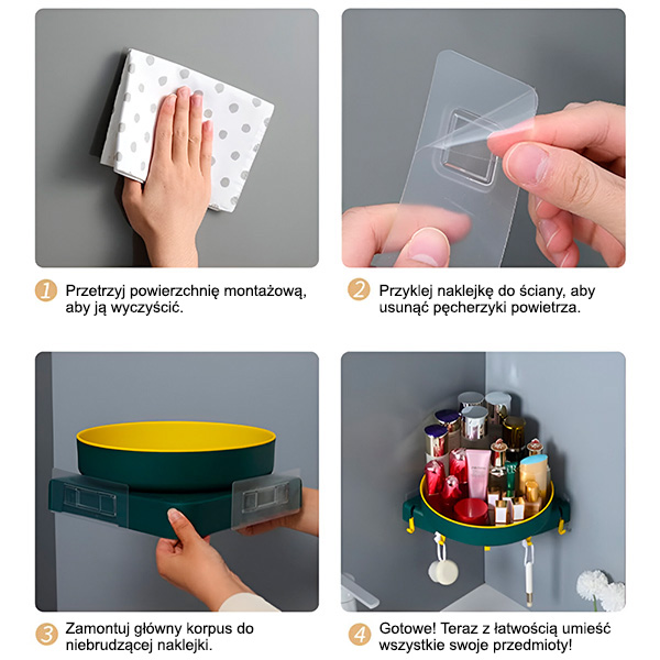 Bez wiercenia! Mocny klej zapewnia stabilność i nie uszkadza ścian. Wystarczy przykleić i zacząć porządkować!